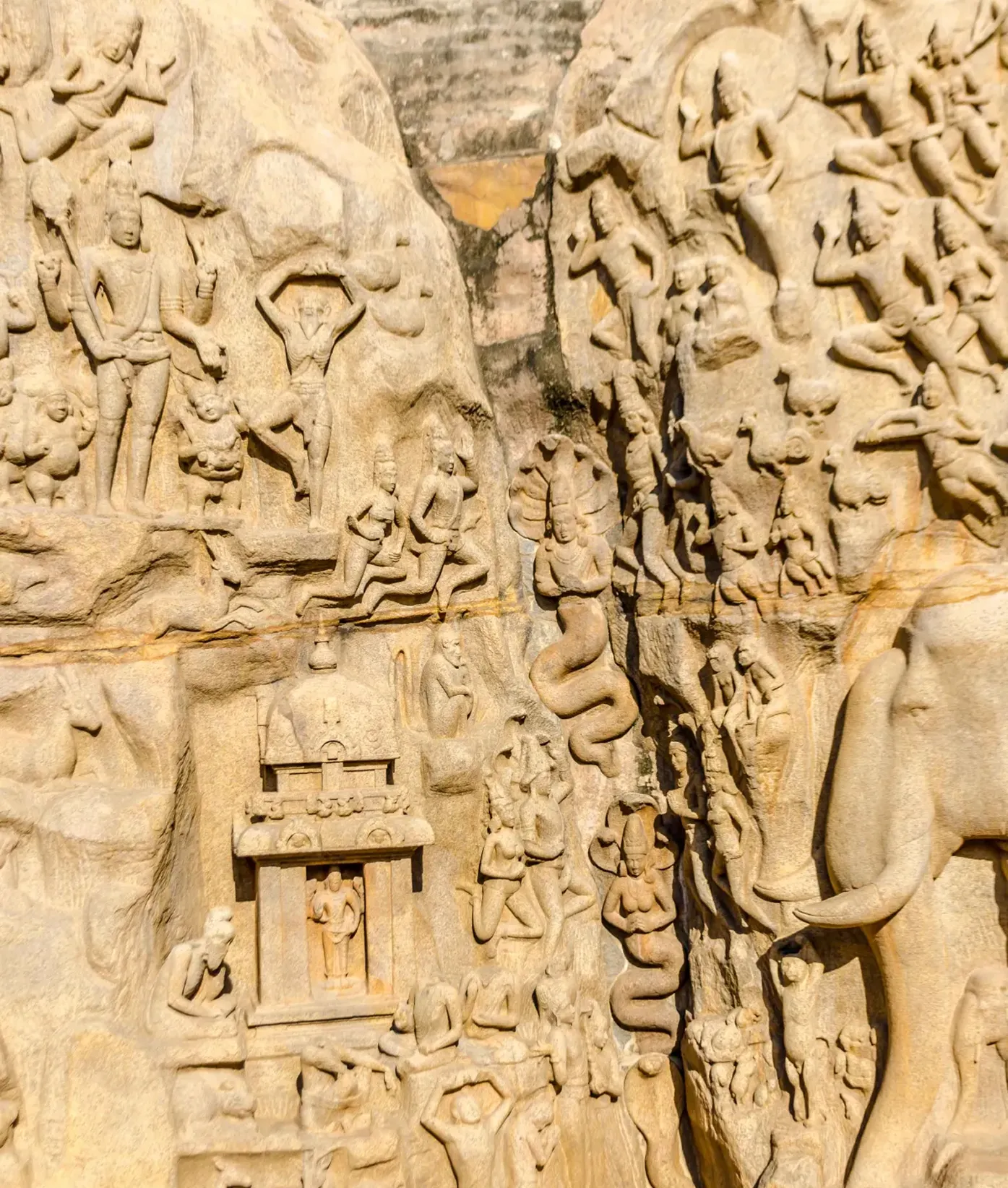 the 6th and 9th centuries CE, serving as a cultural and maritime hub. The town was named after the Pallava king Narasimhavarman I, also called Mamalla, meaning "great wrestler," who greatly patronized the arts and commissioned many of its monumental structures including the Shore Temple, Five Rathas, and the giant open-air relief "Descent of the Ganges." Mahabalipuram is a UNESCO World Heritage Site, celebrated for these architectural marvels and its contributions to South Indian heritage. Key Highlights Major center of Pallava dynasty art and architecture from 6th-9th centuries CE. Features rock-cut cave temples, monolithic rathas (chariot-shaped temples), and structural stone temples. Famous monuments include Shore Temple, Pancha Rathas, and Descent of the Ganges bas-relief. Important maritime and trade port with historical links to Romans and Southeast Asia. Rich blend of Hindu mythology scenes depicted in sculptures. UNESCO World Heritage Site recognized for its exceptional craftsmanship. Named after Pallava king Narasimhavarman I (Mamalla), a great patron of arts.