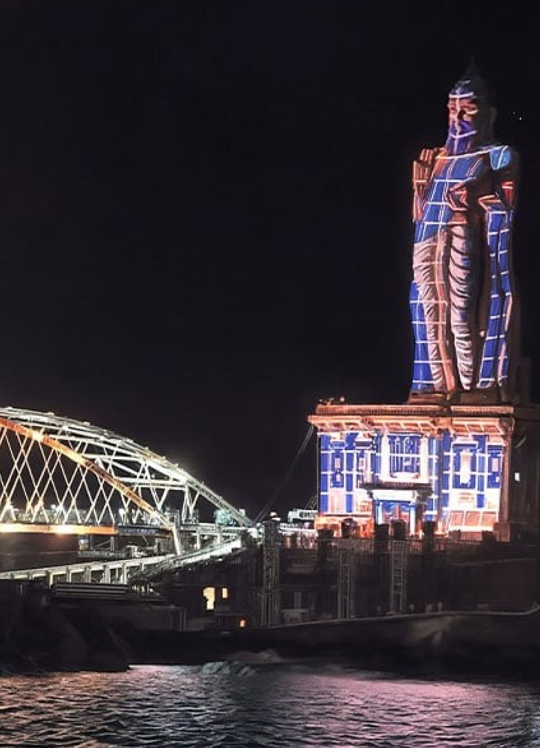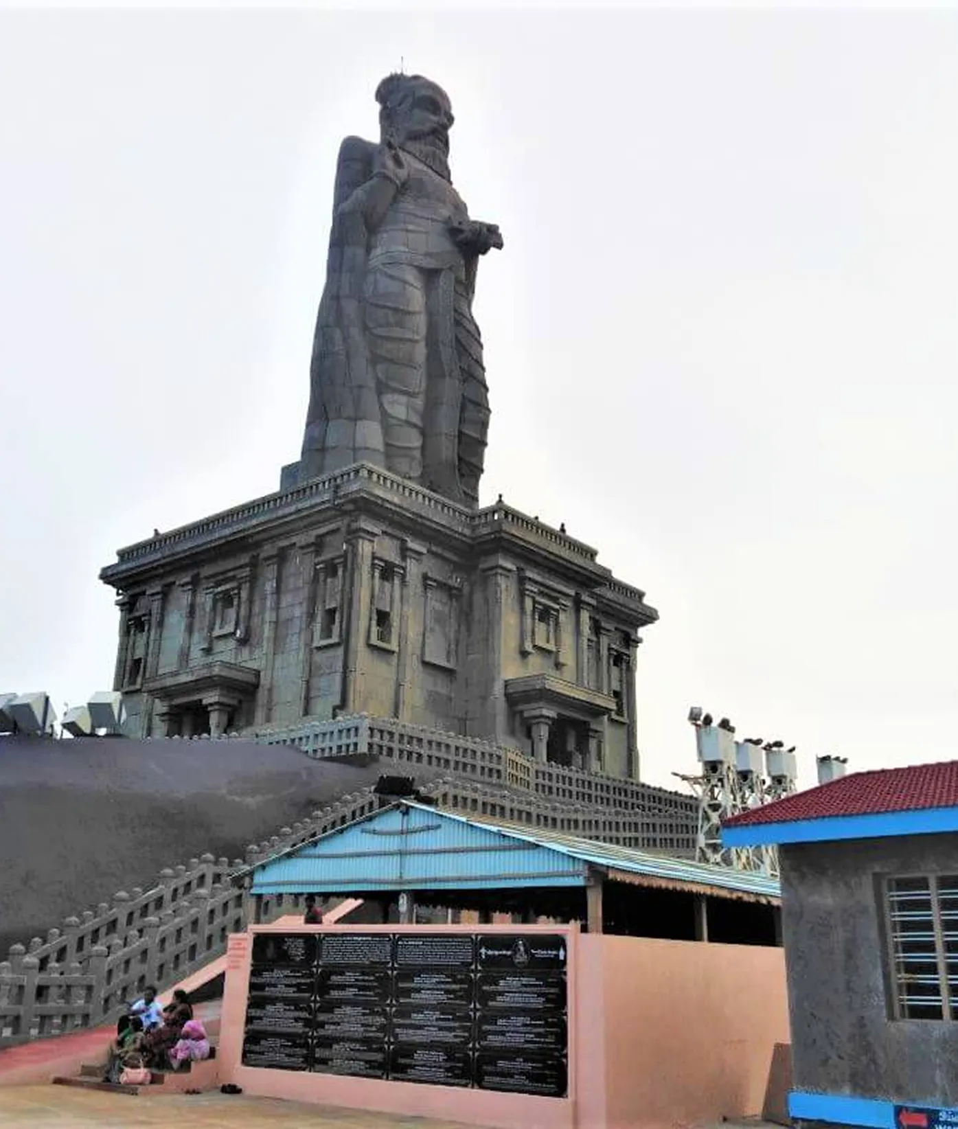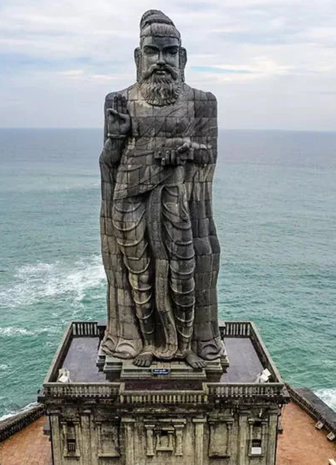 The Thiruvalluvar Statue is a monumental stone sculpture dedicated to the celebrated Tamil poet and philosopher Thiruvalluvar, author of the ancient Tamil literary work "Thirukkural." It stands at a towering height of 133 feet (41 meters) including its pedestal, symbolizing the 133 chapters of the "Thirukkural." The statue itself is 95 feet tall, standing on a 38-foot pedestal representing the 38 chapters on virtue, the first section of the "Thirukkural."